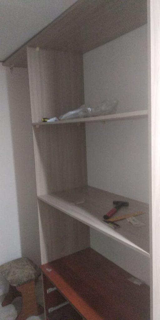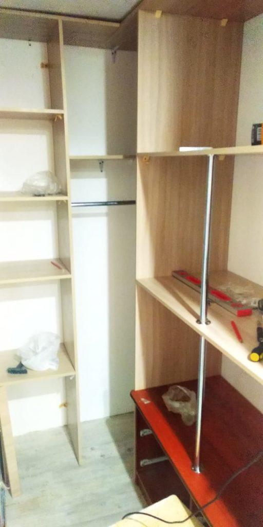 Далее, с помощью длинных листов ЛДСП выстроили вторую часть кладовки. Ее соединили с прежней верхней планкой. Затем установили металлическую штангу нужного размера.