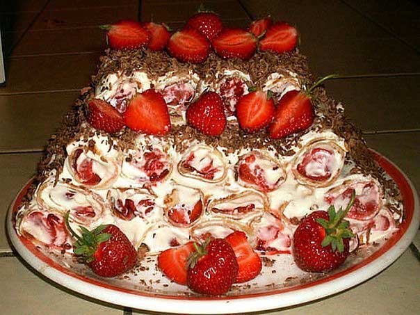 В основание кладем пять трубочек и смазываем их кремом, затем четыре трубочки, потом три, две и на верхушку кладем одну трубочку, каждый новый слой смазываем приготовленным кремом.