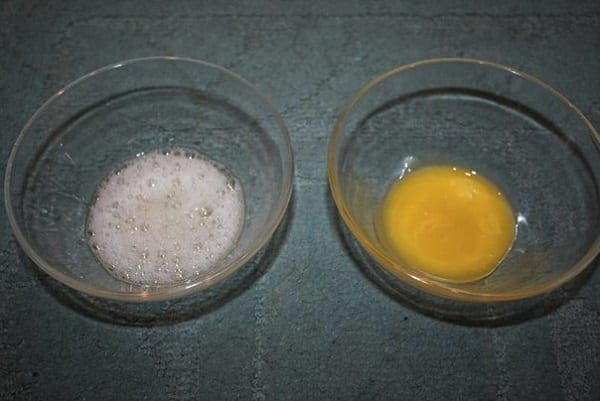 - Отдели желток от белка, помести их по разным мисочкам. Белок слегка взбей вилкой.белок и желток.