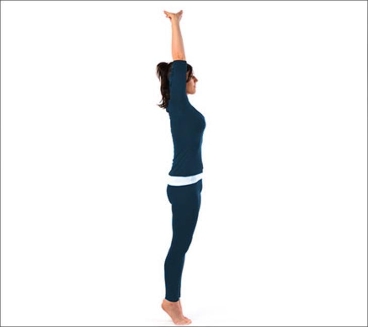 Эта поза позволяет растянуть позвоночник, делая его более гибким и податливым. Исходное положение: стоя, ноги чуть шире плеч, плечи расслаблены. На вдохе медленно поднимите руки ладонями вверх и разведите их на то же расстояние, что и ноги – Вы должны быть похожи на пальму. Далее дышите ровно и пробуйте встать на носочки, сохраняя равновесие. При этом тянитесь макушкой вверх.