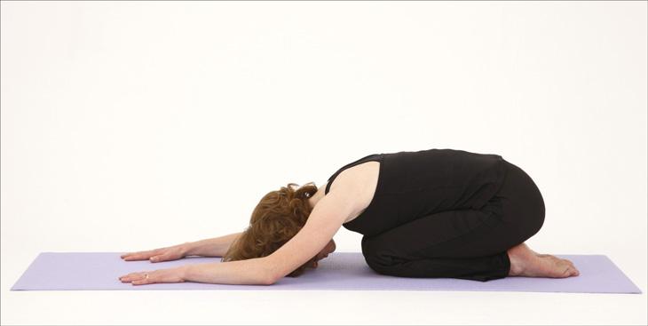 Это упражнение хорошо прорабатывает шейный и грудной отделы позвоночника. Исходное положение: стоя на коленях. Опустите таз на пятки, руки прямые. На вдохе поднимите руки вверх, плечи должны прижиматься к ушам. На выдохе потянитесь руками вперед и наклонитесь всем телом. Постарайтесь не отрывать ягодицы от пола. Далее положите руки на пол и попробуйте прижаться лбом к полу. Дышите ровно, задержитесь в такой позе на 51-20 секунд и вернитесь в исходное положение.