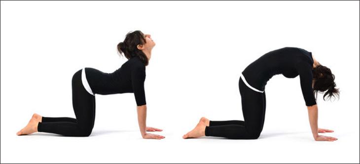 Встаньте на четвереньки. На выдохе выгните спину вверх, подбородок направьте к груди. Со вдохом запрокиньте голову, смотрите вверх, прогнув при этом спину вниз. Повторите пять раз.
