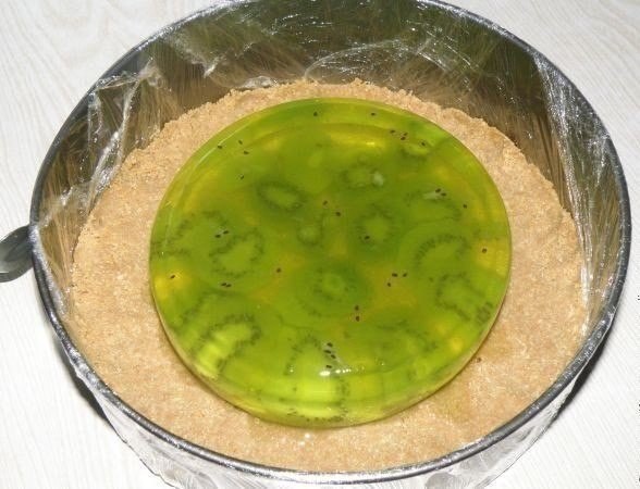 8. Миску подержала немного в горячей воде и желе легко отошло от судка. Формой для торта накрыла сверху и перевернула, вот так оно оказалось посредине.