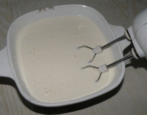 11. Не выключая миксер тонкой струйкой добавила молоко с желатином. Это делается для того, чтобы не появились комки и желатин сразу не схватился от холодной сметаны.