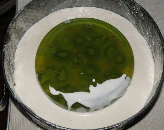5. Через некоторое время добавила нарезанное дольками киви. Именно это и стало моей ошибкой. Оказывается киви и ананас нельзя добавлять свежими в желе, так как они нейтрализуют действие желатина.